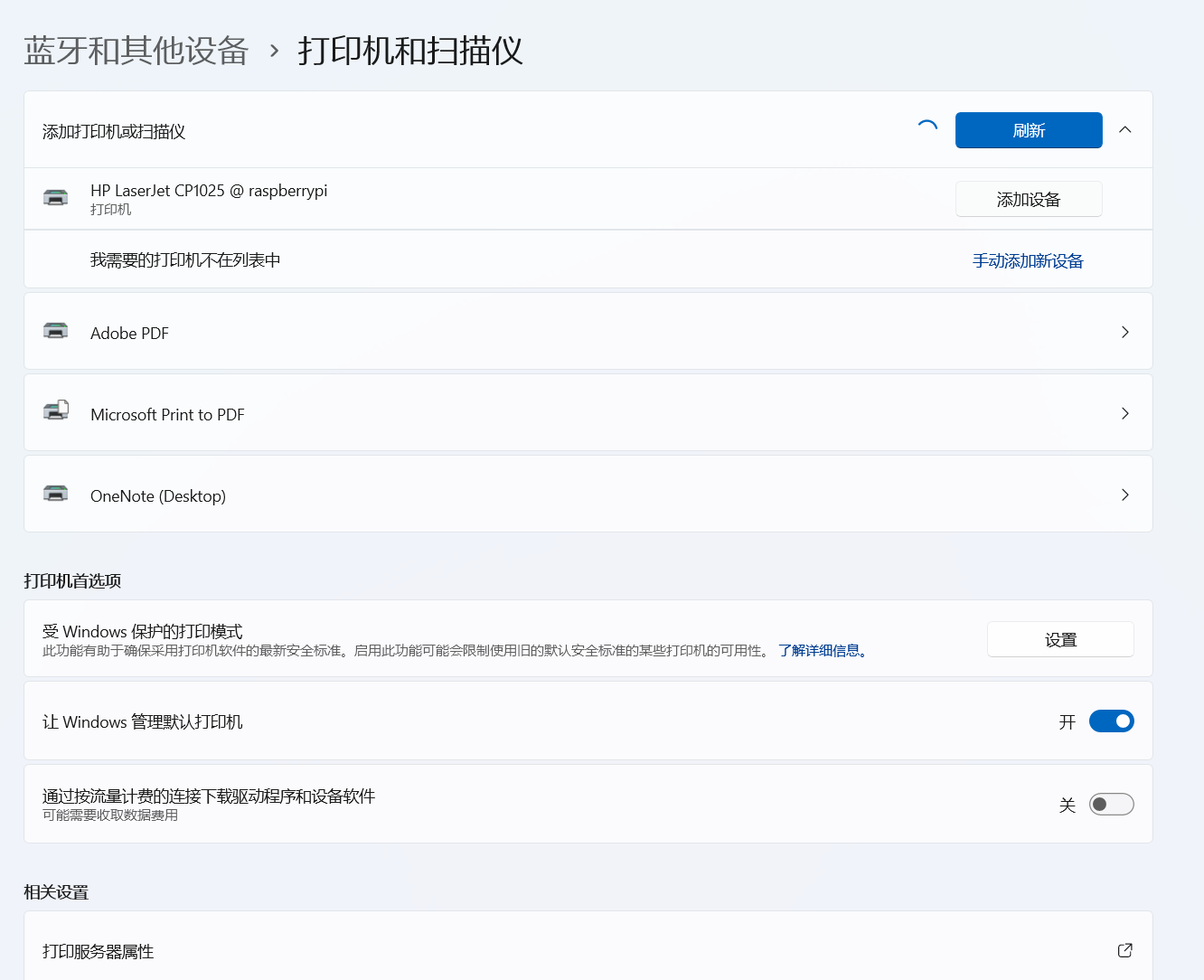 打印机和扫描仪里点击’添加设备’后设备会显示在列表中。选择对应的打印机,点击”添加设备”即可完成打印机的添加。