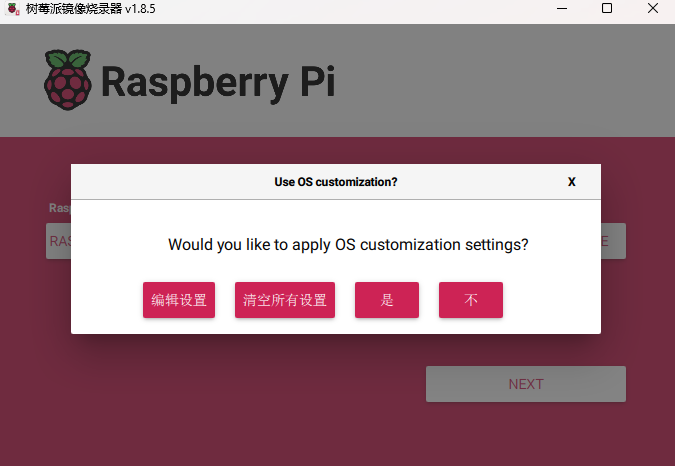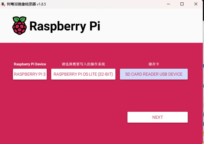 设备选择”RASPBERRY PI3”,操作系统选择”RASPBERRY PI OS LITE(32-BIT)”,并选择对应的SD卡。点击NEXT