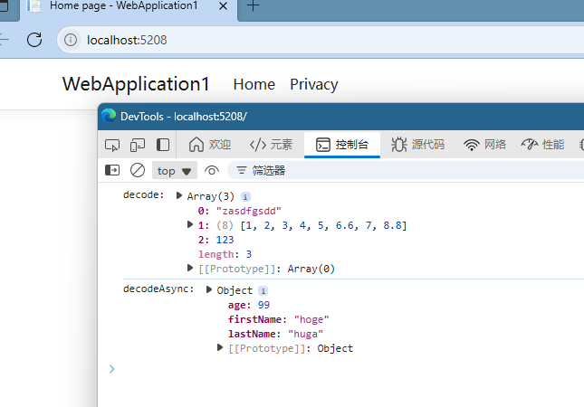运行程序,查看浏览器控制台输出(变量键值如果是字符串,那么在html下反序列化后得到的object可以很方便的使用。反之反序列化后得到的是一个数组,用起来相对麻烦一些)。