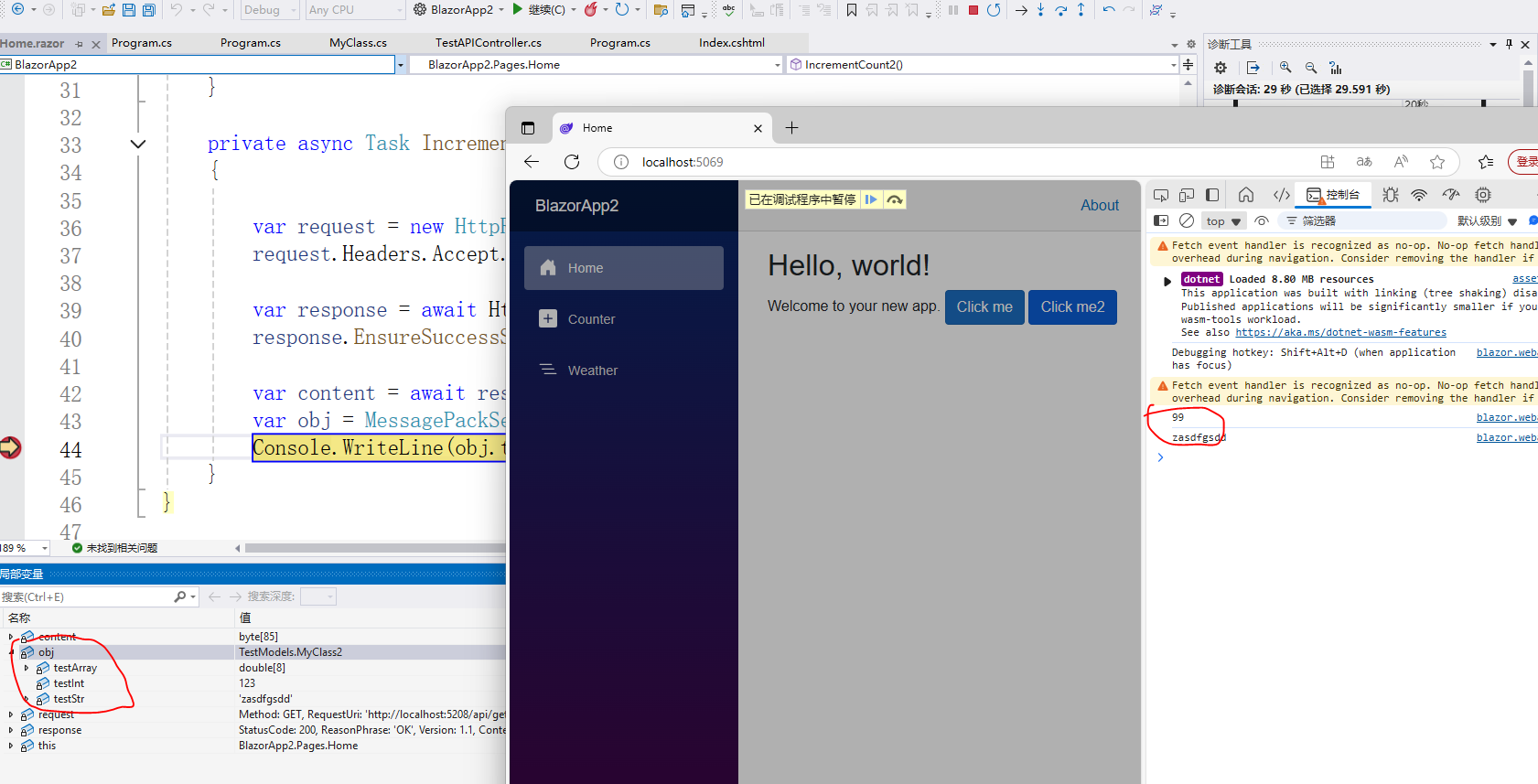 - 编辑Home.razor,添加测试代码运行服务端程序和Blazor程序,点击Home页面下的按钮并在断点以及控制台查看效果。